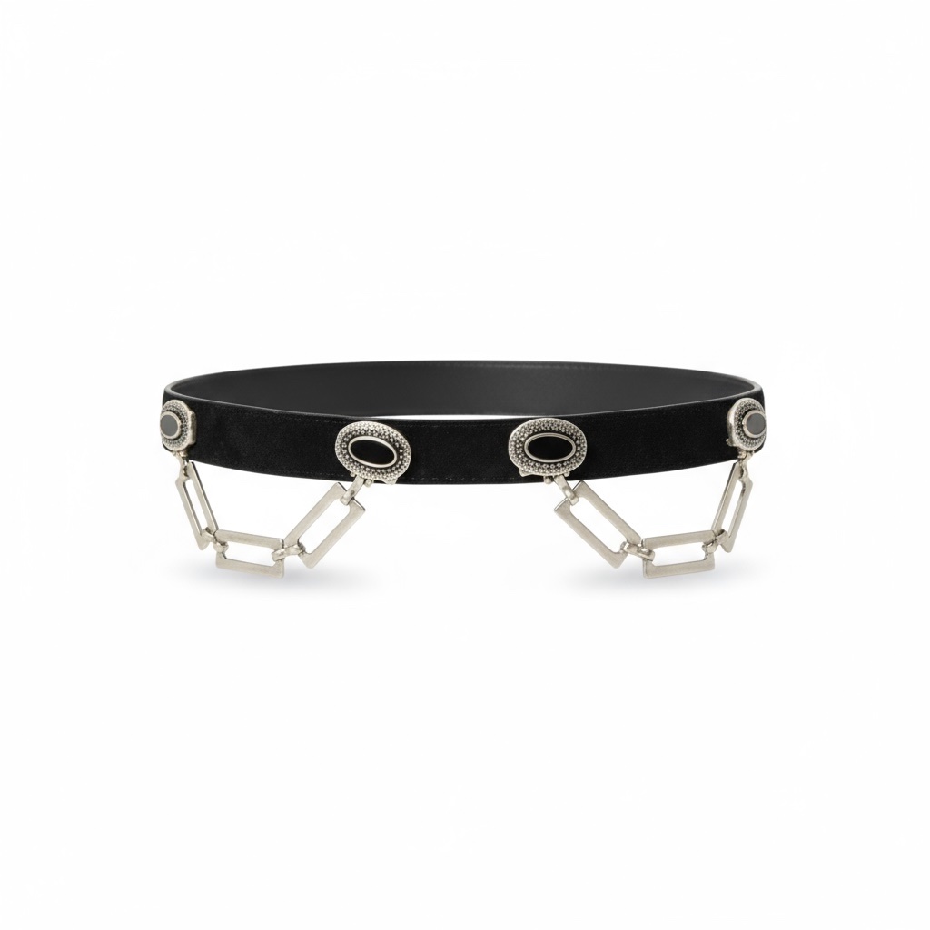 Μια ζώνη που μετατρέπει κάθε εμφάνιση σε fashion statement. Χειροποίητη από μαύρο suede δέρμα, διακοσμημένη με ασημένιους κρίκους και γεωμετρικές αλυσίδες που αγκαλιάζουν τη μέση με μοναδικό στυλ. Τολμηρή, θηλυκή και εκλεπτυσμένη, συνδυάζεται ιδανικά με φορέματα ή ψηλόμεσες φούστες για να δώσεοι ένταση και χαρακτήρα *Κούμπωμα: Κομψή μεταλλική αγκράφα υψηλής αντοχής Πλάτος : 2,5εκ