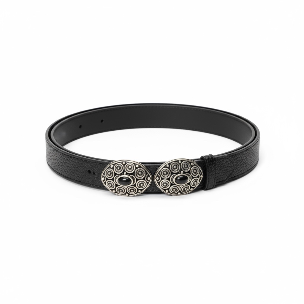 H γυναικεία μαύρη δερμάτινη ζώνη με ασημί αγκράφα είναι η επιτομή της μοντέρνας κομψότητας. Το μαύρο δέρμα αναδεικνύεται μέσα από την λάμψη του ασημιού, δημιουργώντας έναν δυναμικό συνδυάσμο. Ιδανική για να συνοδεύσει απο ένα αυστηρό office look μέχρι ένα πιο βραδινό outfit, χαρίζοντας στη μέση καθαρή γραμμή και διακριτική πολυτέλεια
