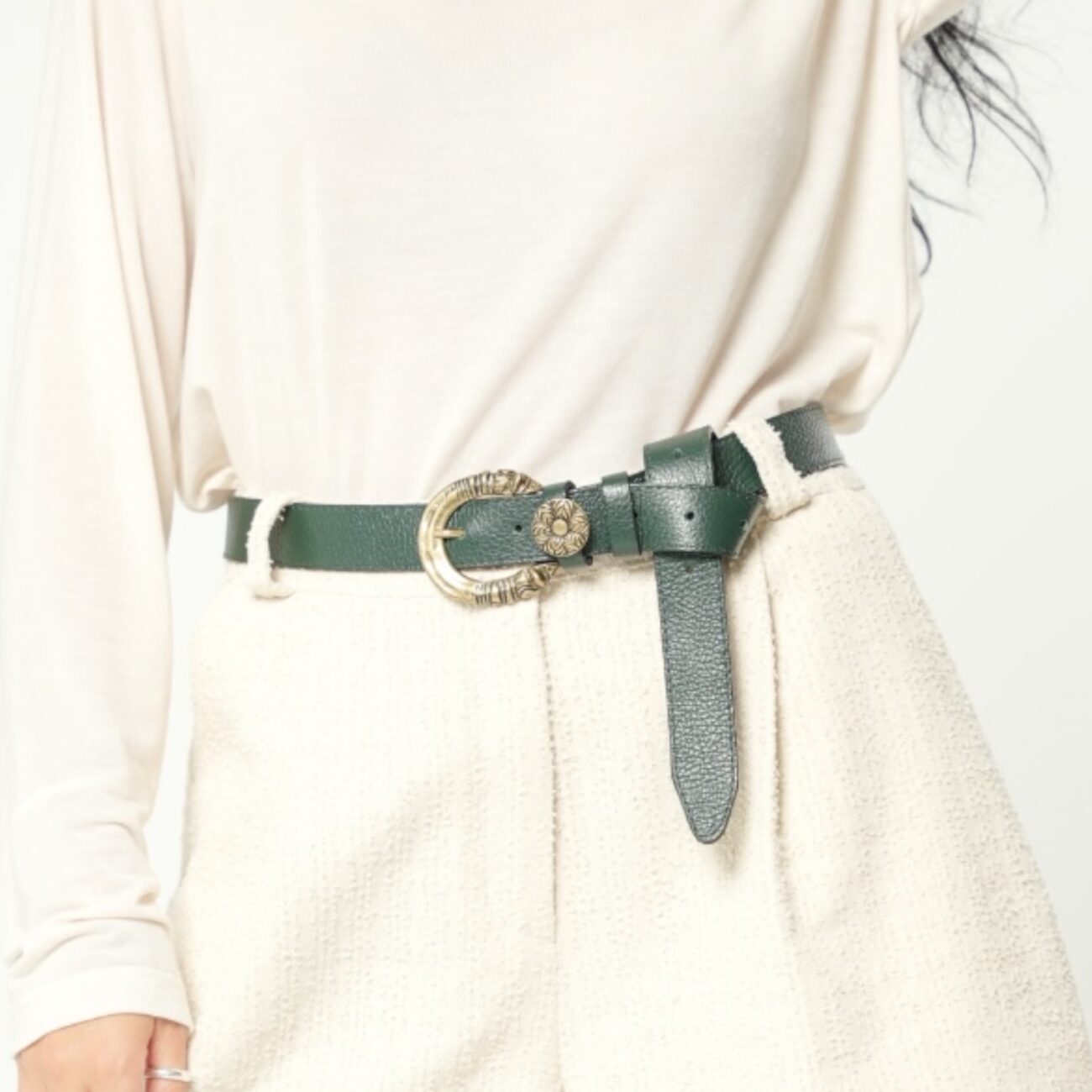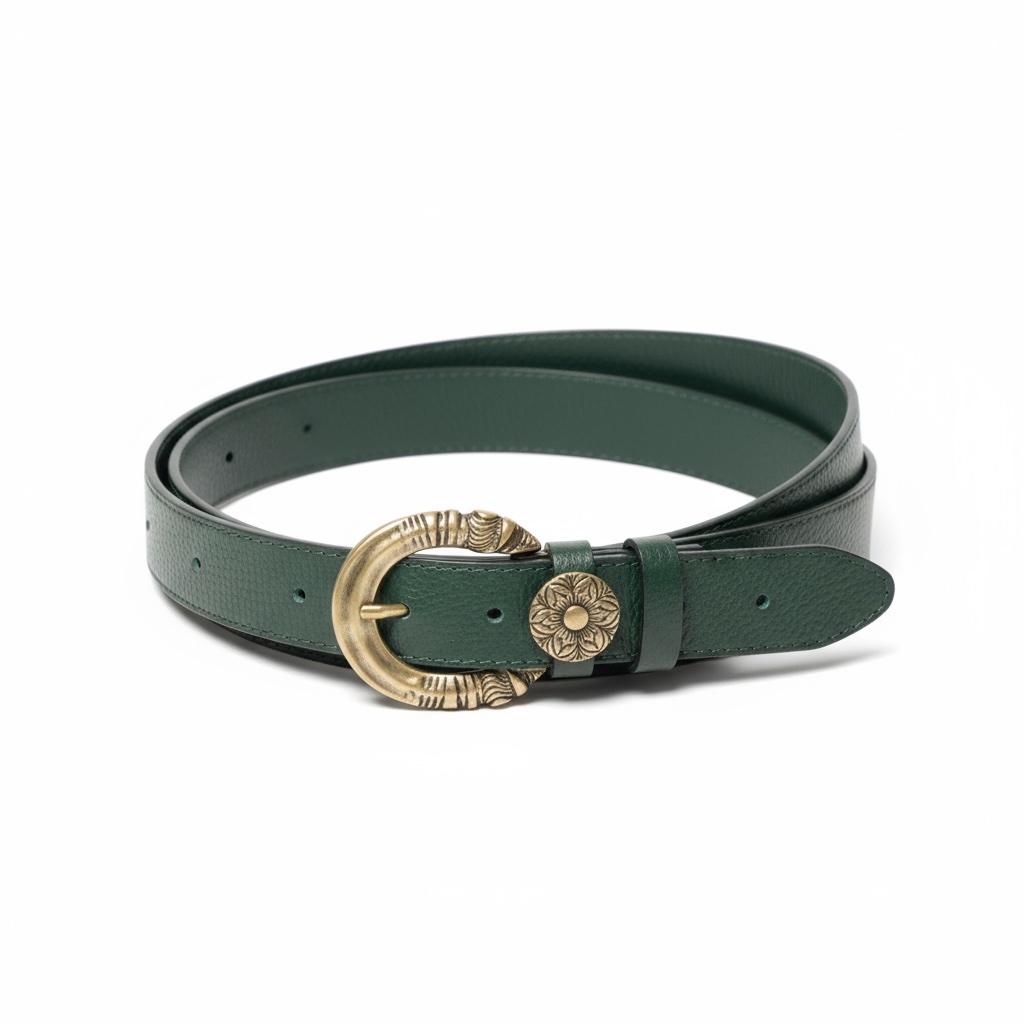 Δερμάτινη ζώνη σε σκούρο πράσινο χρώμα χρώμα, με χρυσή αγκράφα. Κομψή και ευκολοφόρετη, ταιριάζει ιδανικά με παντελόνια, φούστες ή φορέματα προσθέτοντας μια ξεχωριστή πινελιά στο καθημερινό στυλ. *Κούμπωμα: Κομψή μεταλλική αγκράφα υψηλής αντοχής